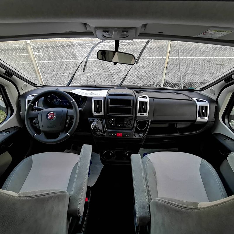 Célula: 2 camas de casal (central + mesa), WC e duche separados, frigorífico automático 150L, fogão Thetford de 3 bocas, sanita química Thetford, estofos bi-color, iluminação LED primária e indireta.